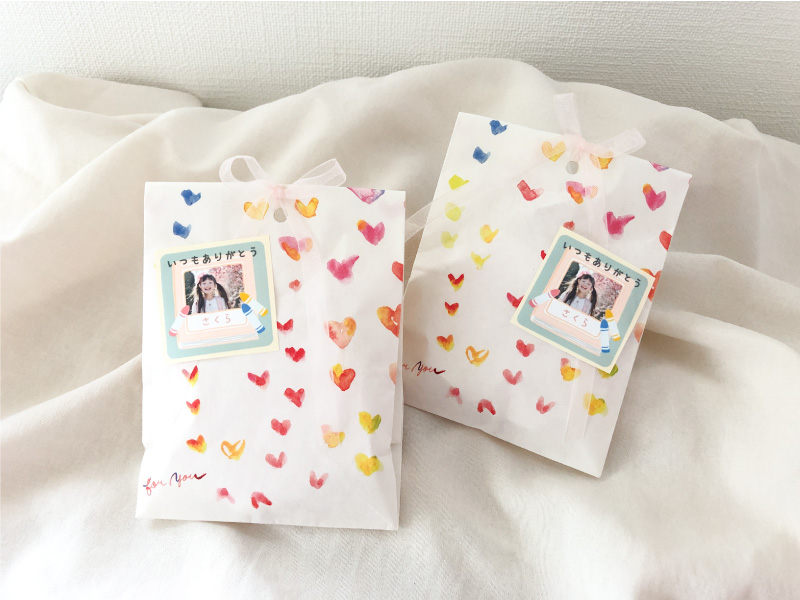 ラッピングアレンジをもう一つ。袋に入れてそのままシールで留めるのがスタンダードですが、こちらでは袋の口をパンチで穴を開けリボンや紐で封をしました。リボンの端をシールで留めれば、よりセンスあるアレンジになりました!