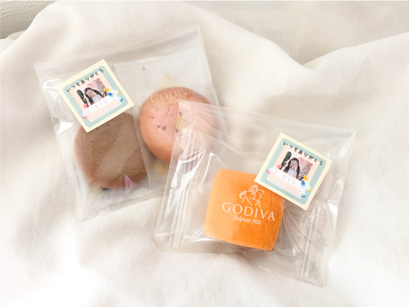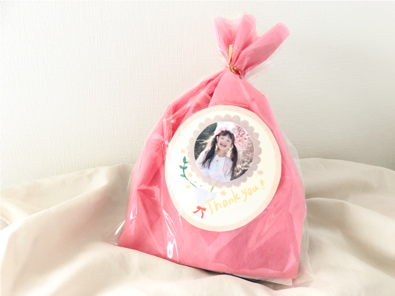 1枚に大きく印刷したThank youシールはフレームに沿って切り大きめのギフトバッグに、小さいサイズでたくさん印刷した名前入りシールは切り分けてお裾分け用に準備したお菓子に貼ってみました!封をした袋にそのまま貼るだけでもインパクトのある仕上がりになりました。袋や包装紙がシンプルなものでも、これで誰もが驚くオリジナルギフトになりますね!