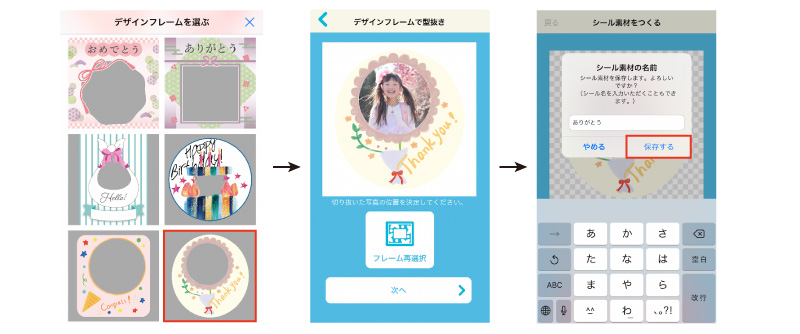 種類はたくさんありますが写真に合いそうなこちらのフレームを使用しました。写真の大きさを合わせて配置し、シール素材を保存しましょう。