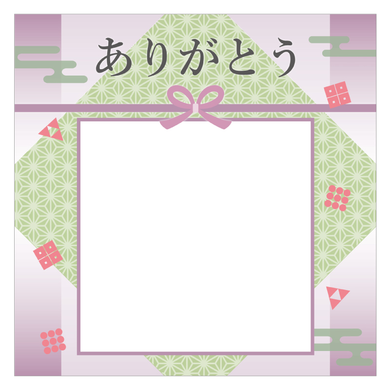 二つ目のおすすめはこちら、和柄と水引のデザインがエレガントなありがとうフレームです。いつも優しいおばあちゃんに似合いそうですね!おばあちゃんと一緒に撮った思い出の写真を入れてシールを作りました。