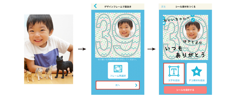 コンビニシール倶楽部のアプリから選べる写真フレームは数十種類!メッセージ入りのフレームもたくさん登録されているので、写真を選ぶだけで気持ちが伝わるシールの完成です。