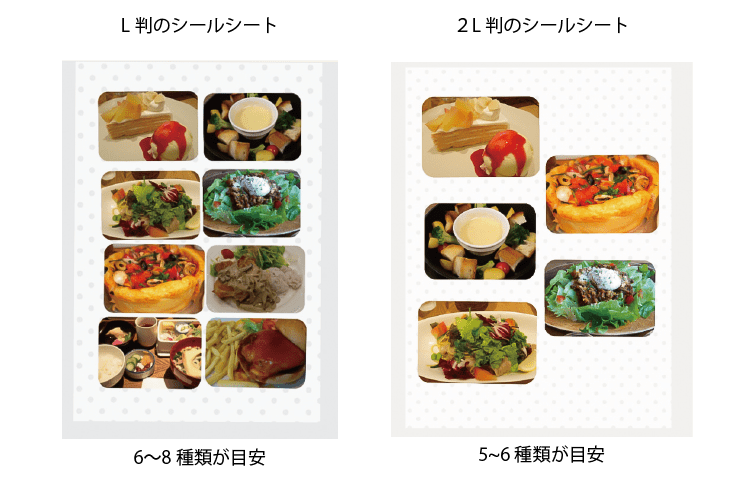 まずは、印象に残っているご飯写真をアプリでシール素材とシールシートにしていきます。シートに配置する素材の数はL判では6~8種類、2L判では5〜6種類ほどが目安にすると良いかもしれません。