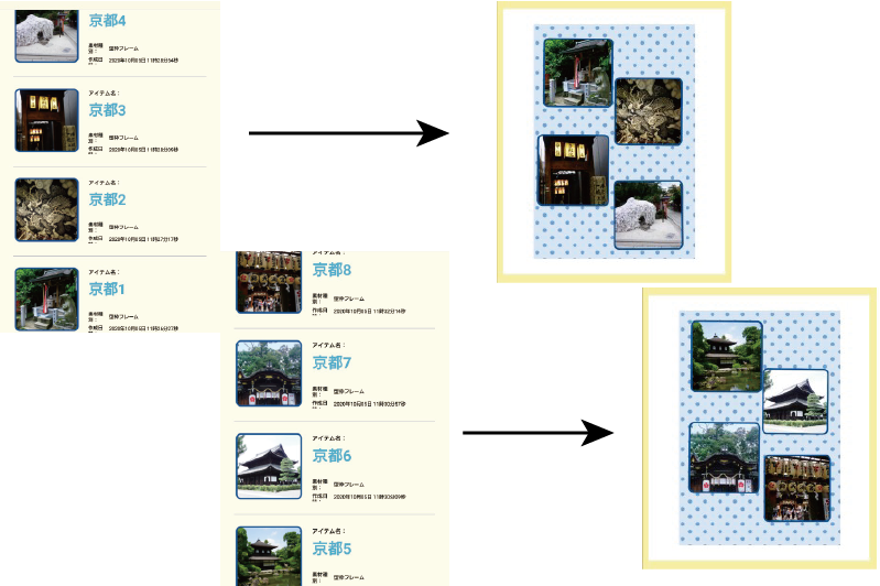 まずは、旅行に行ったらついつい撮影してしまう神社やお寺の写真をシール素材にしていきます。今回は型枠フレームで枠線に色を付けた素材で8種類選んでみました。