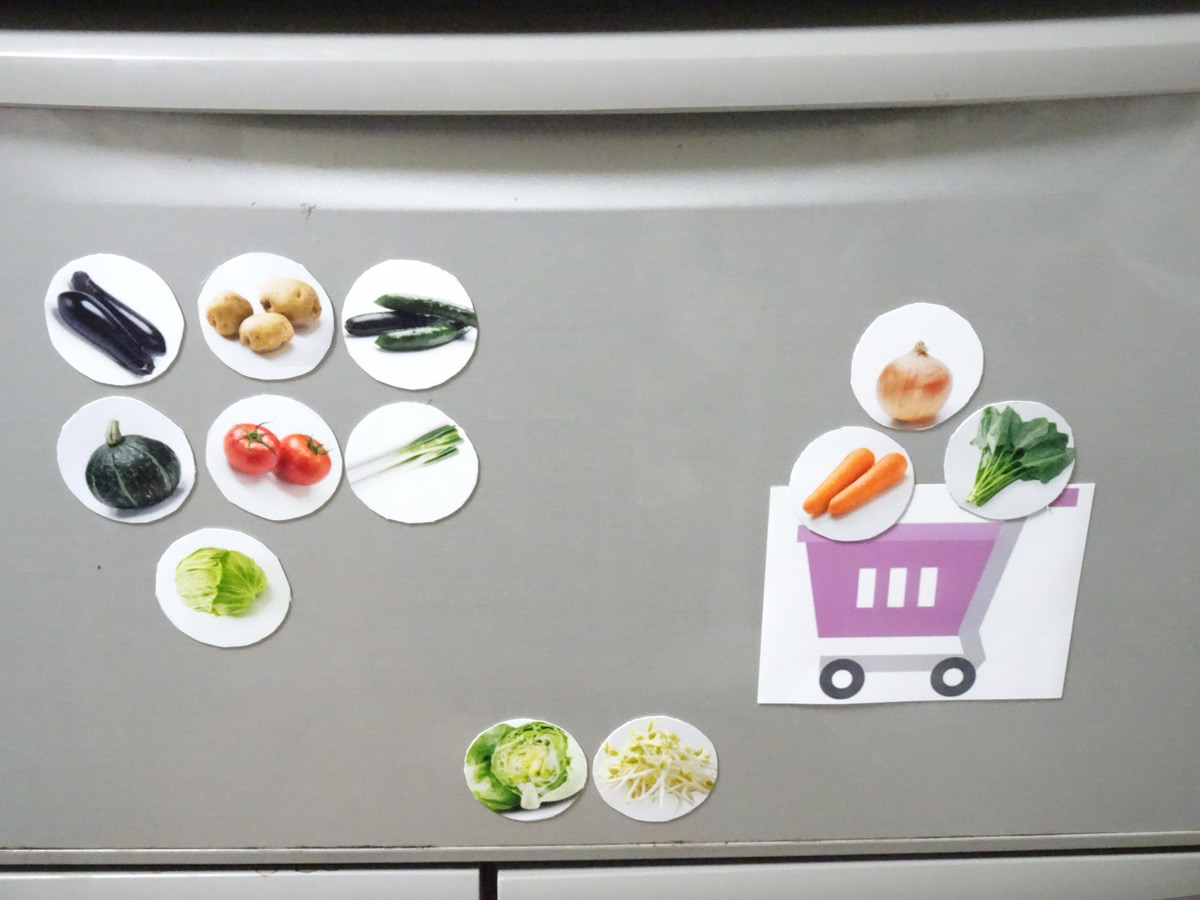 そして、買い物カゴのイラストの上に次回買い足したい野菜を乗せる事で今冷蔵庫にない野菜をすぐに把握出来るようになりました。下は今買う必要のない野菜を置いてみました。