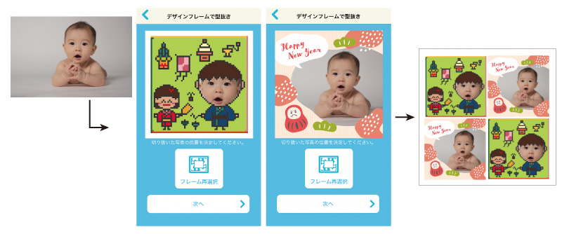 それでは、こちらのフレームを使ってシールを作成します。シリーズで揃えられるフレームはお子様の成長記録にもおすすめです。特にドット絵の顔ハメフレームは誰でも楽しめるシールになりますね!