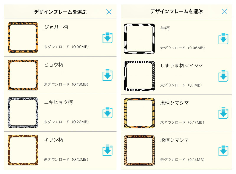 デザインフレームは使用したいものを選びダウンロードして取り込む仕様となりました。一覧からお気に入りのフレームを探してみてください!