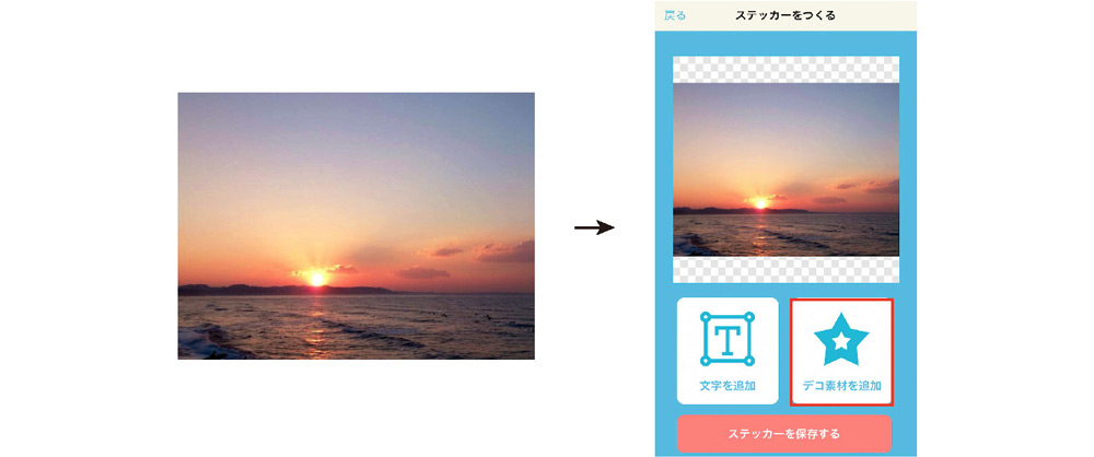 最後は種類豊富なデコ素材を使って写真をアレンジする方法をご紹介します。スタンプのような素材がたくさん登録されているので、写真が簡単にアレンジできるので試してみてください。