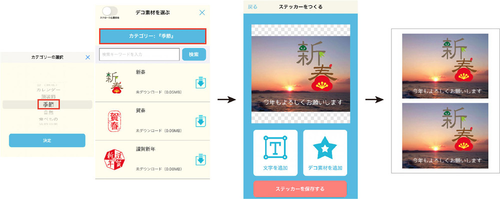 カテゴリーで季節を選択すると、「新春」や「謹賀新年」といった文言の素材が選べます。可愛いデコ素材に文字も加えて、年賀状やポチ袋に貼れるようなシールを作成してみました。