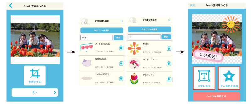 デコ素材はカテゴリー選択からも、「吹き出し」「花」などのワードを入力しても検索することが出来ます!いろんな種類のスランプがあって飽きずに楽しめますね!!