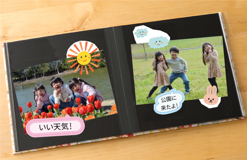 2つ目は、思い出の写真をコラージュしてアルバムを作ってみましょう! コラージュとは写真や色紙を切り抜いたり、マスキングテープやシールで写真をデコレーションしたボードのこと。一から作るにはデコレーション素材をたくさん集める必要がありますが、コンビニシール倶楽部なら、シールでアレンジしたような写真をそのまま印刷することが出来ます!