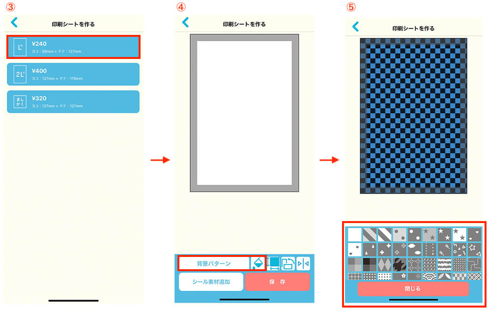 【1】最初のシール画面に戻り「印刷シートを作る」を選択するとシートのサイズが選べます。