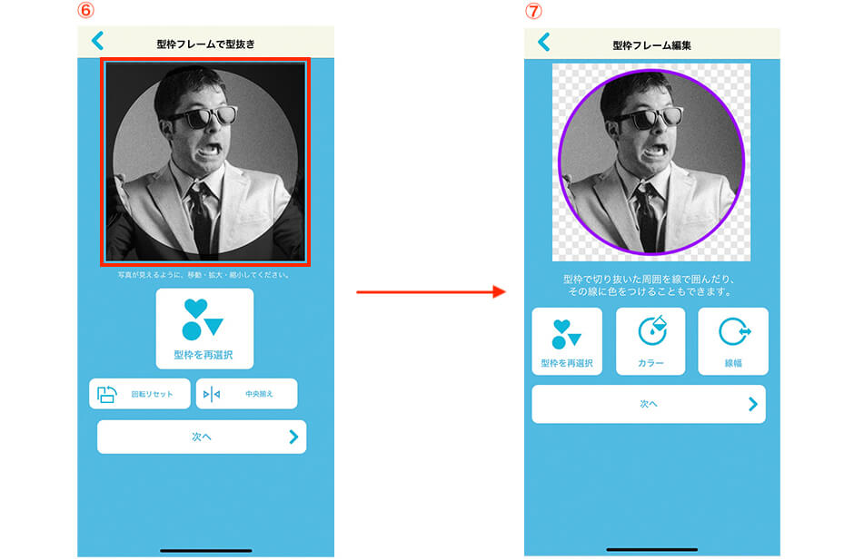 丸いステッカーを作りたいので【型枠フレームで型抜く】を選択します。他にも種類は豊富にあるのでお好みで選んでください。