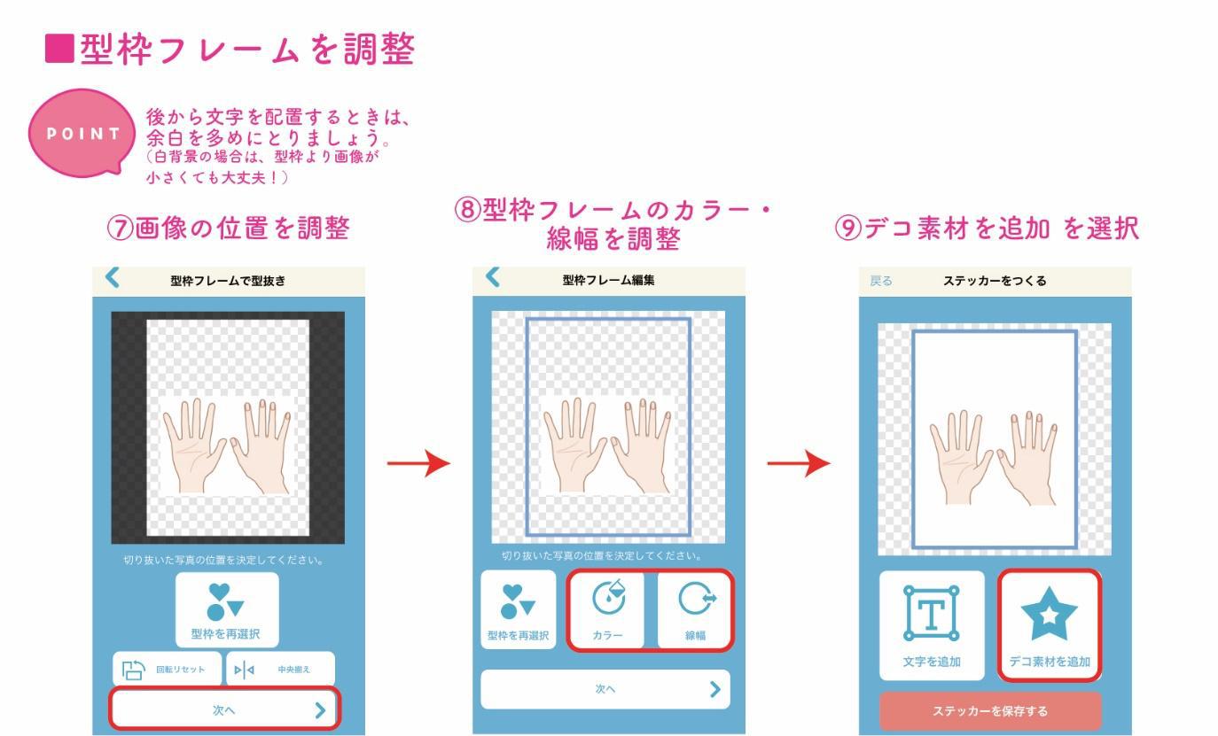 型枠フレームのカラーと線幅を調整したら、「デコ素材を追加」を選択します。