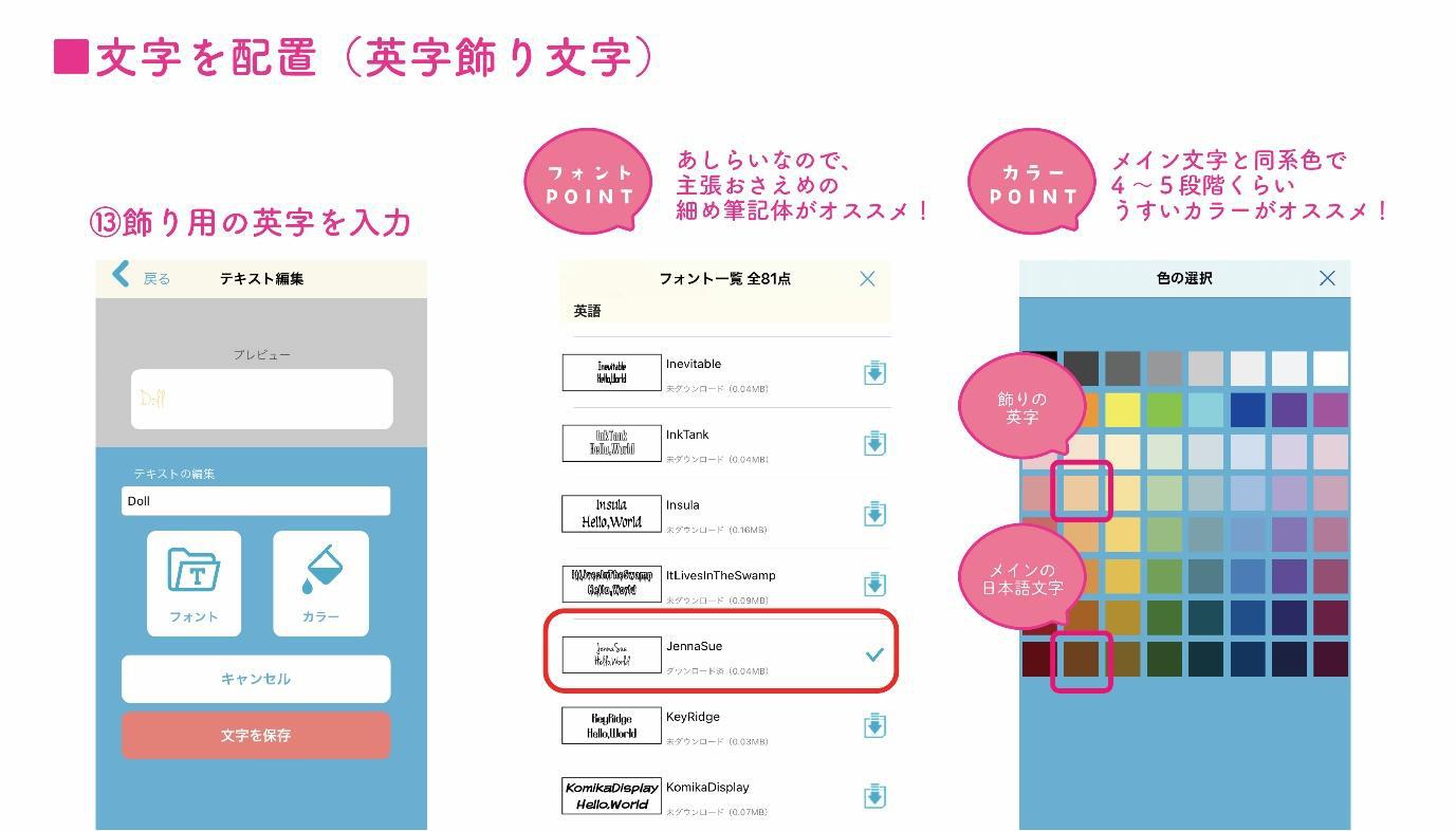 飾り用なので、視認性よりもおしゃれさ重視でOKです!今回は、手書き風で抜け感のある「JennaSue」というフォントを選びました。