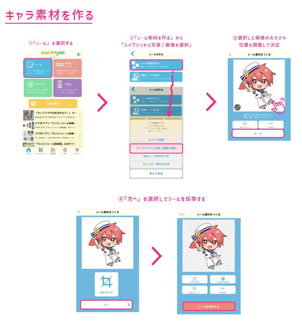 アプリトップ「シール」>「シール素材をつくる」>「ライブラリから写真/画像を選択」で用意しておいたキャラのイラストを選択して、位置を調整したら決定して保存するよ。