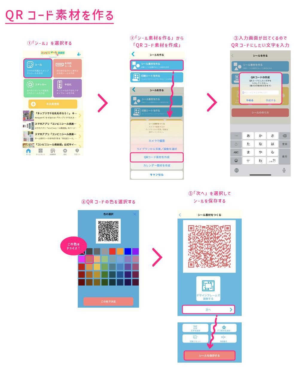 アプリトップ「シール」>「シール素材をつくる」>「QRコード素材を作成」を選んで、QRコードにしたい文字を入力するよ。その後、QRコードの色を選択して保存しよう。