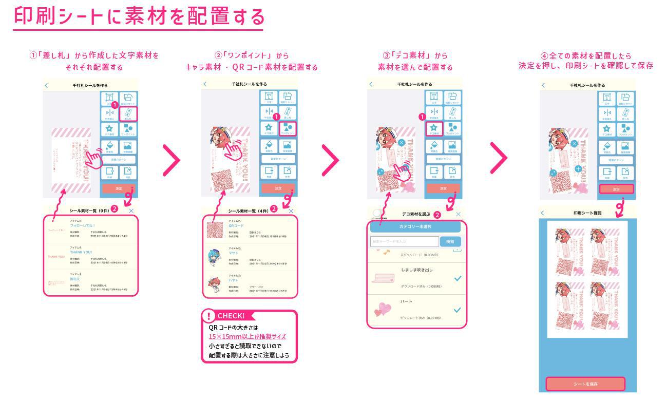 差し札から作った文字素材、ワンポイントからキャラクターとQRコード素材をそれぞれ配置していくよ。