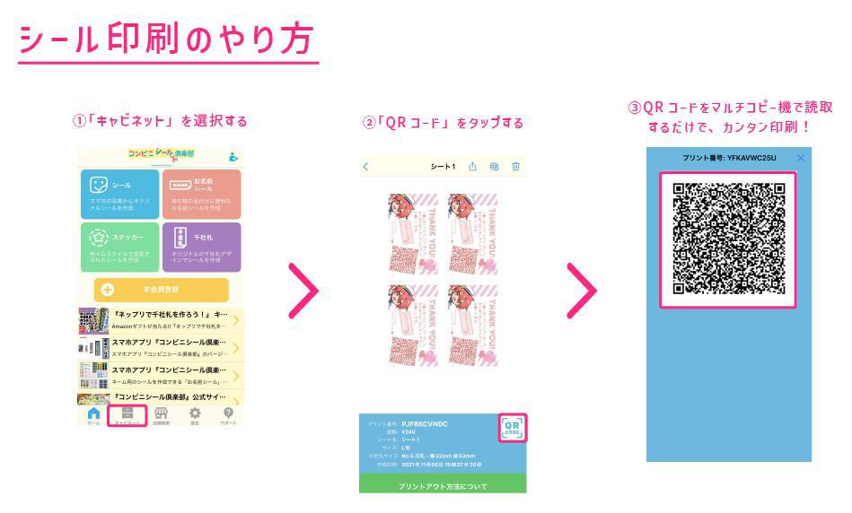 アプリトップ「キャビネット」から作ったデザインを選択して「QRCODE」をタップしてみてね。QRコードをマルチコピー機にかざすだけでカンタンに印刷できるよ!とっても便利~♪