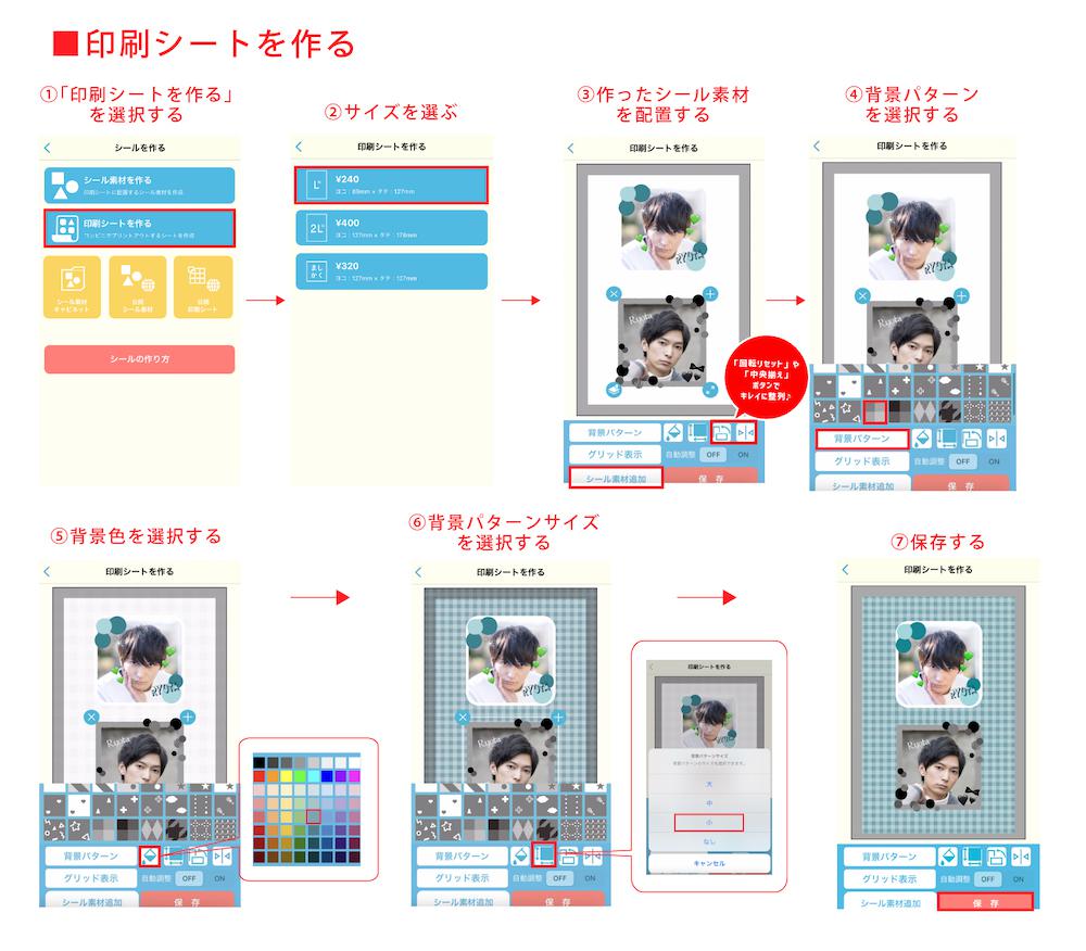 アプリのトップ画面から「シール」→「印刷シートを作る」でサイズを選びます。今回はL版サイズにしました!
