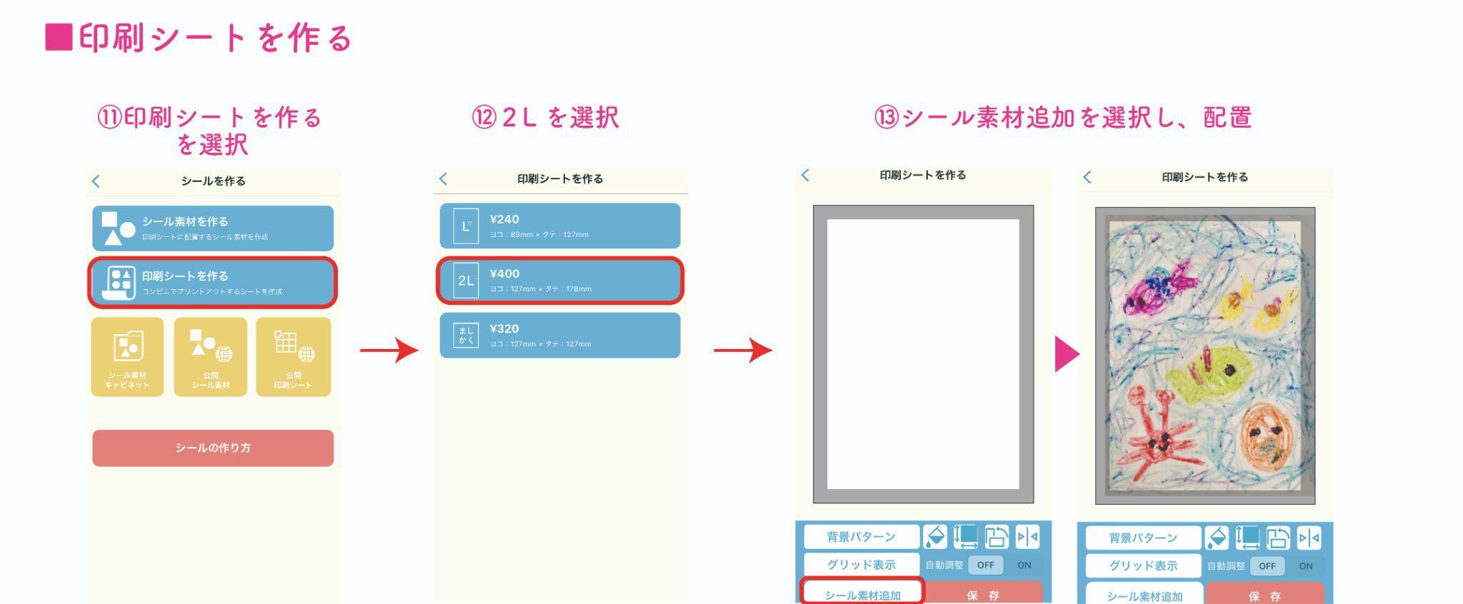 印刷シートを作る>サイズの選択で、今回は一番大きい2Lサイズを選択。「シール素材追加」から先ほど作ったシール素材を配置します♪