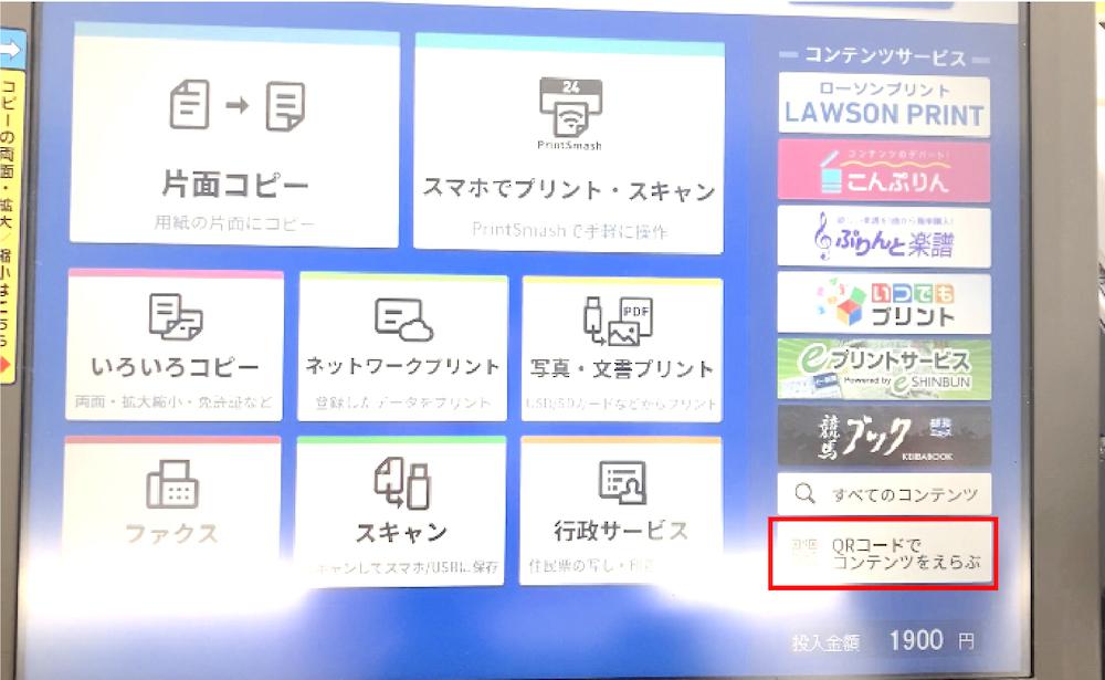 マルチコピー機の操作は、トップ画面右下の「QRコードでコンテンツをえらぶ」をタップします。