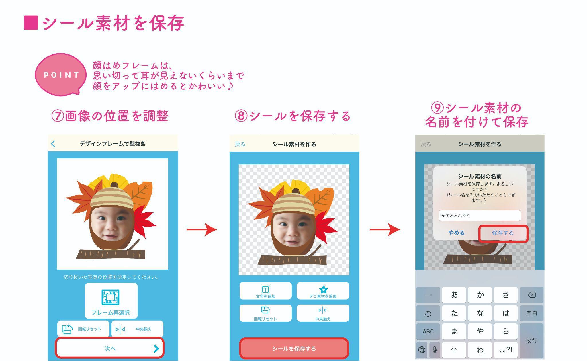 顔はめフレームを使う場合は、思い切って耳が見えないくらいまで顔をアップにはめたほうがかわいいです♪