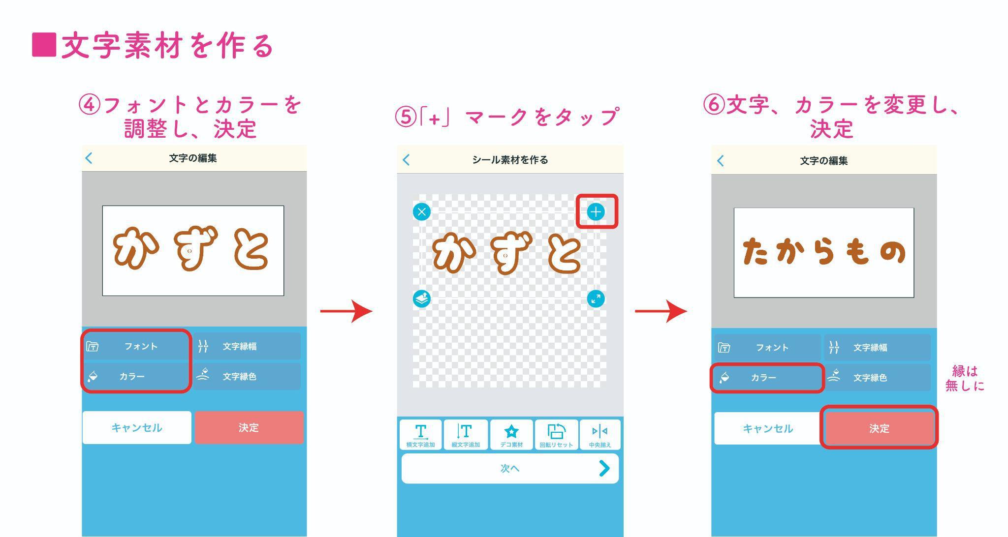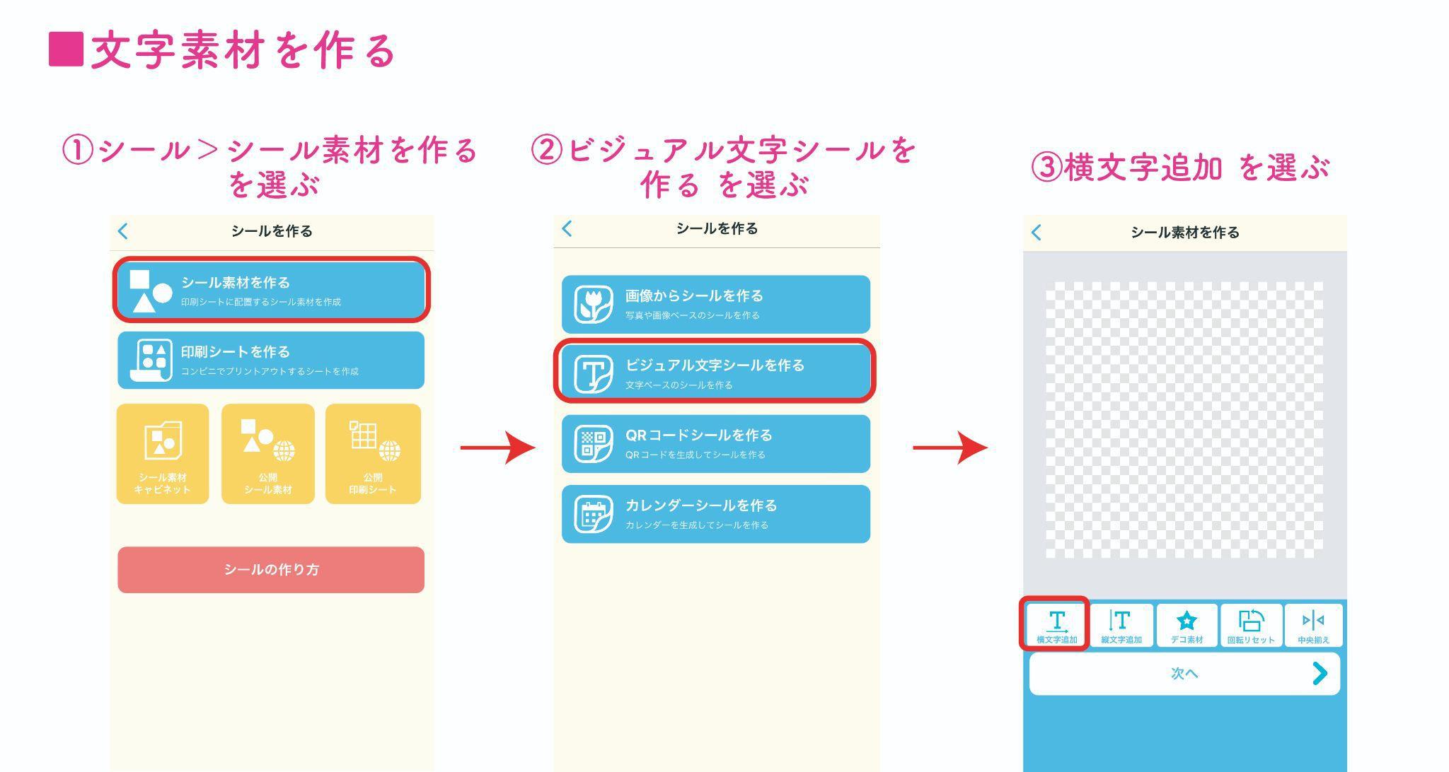 「シール素材を作る」から、「ビジュアル文字シールを作る」を選び、「横文字追加」を選択します!