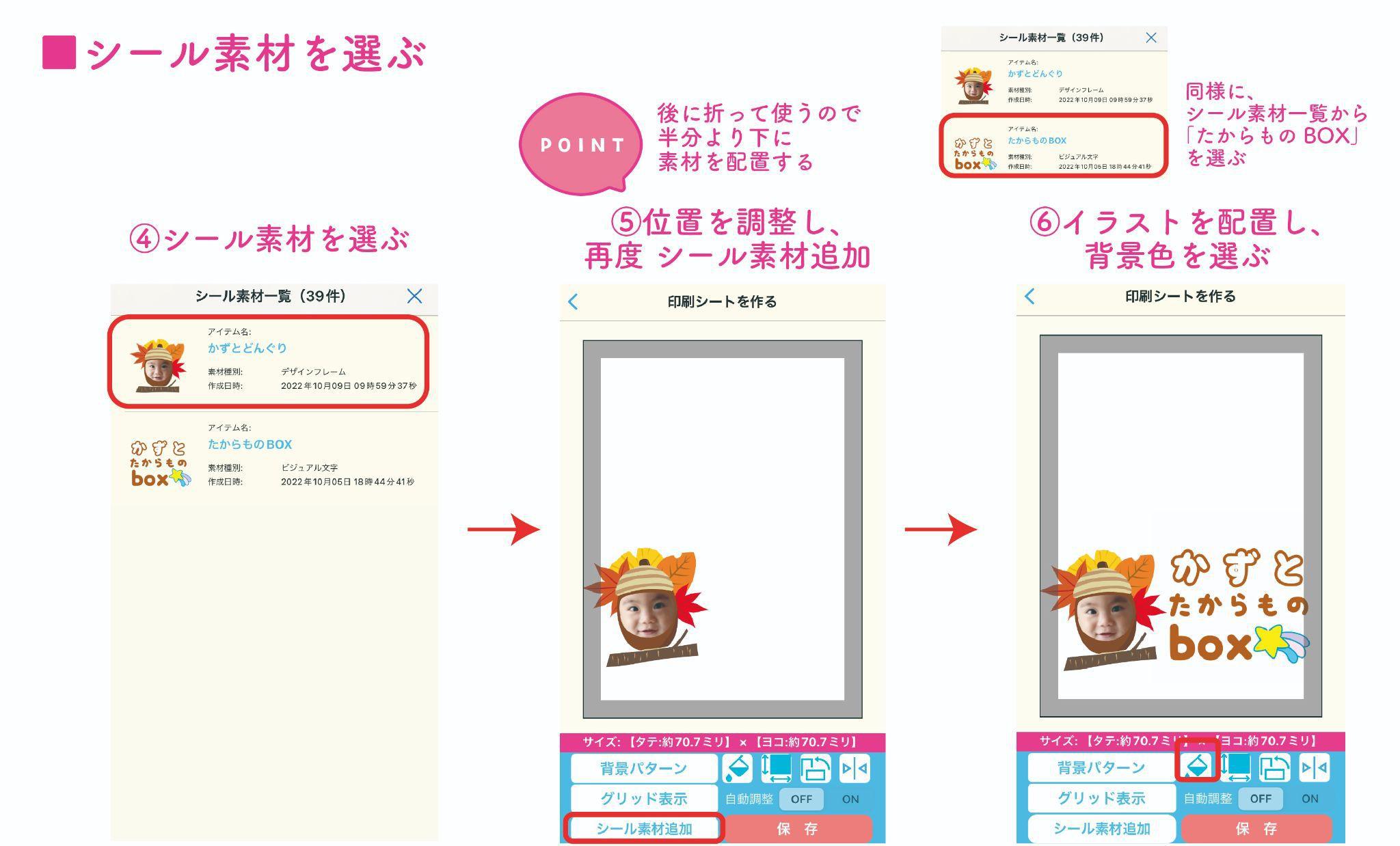 「シール素材追加」から、先ほど作ったシール素材を配置します♪