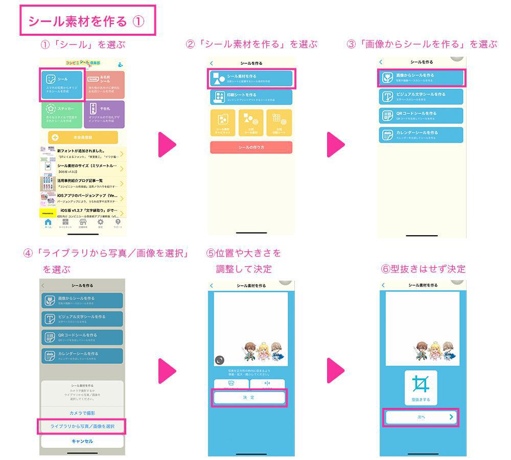 アプリを開いたら「シール」>「シール素材を作る」>「画像からシールを作る」>「ライブラリから写真/画像を選択」をタップし、入れたい画像を選択するよ。