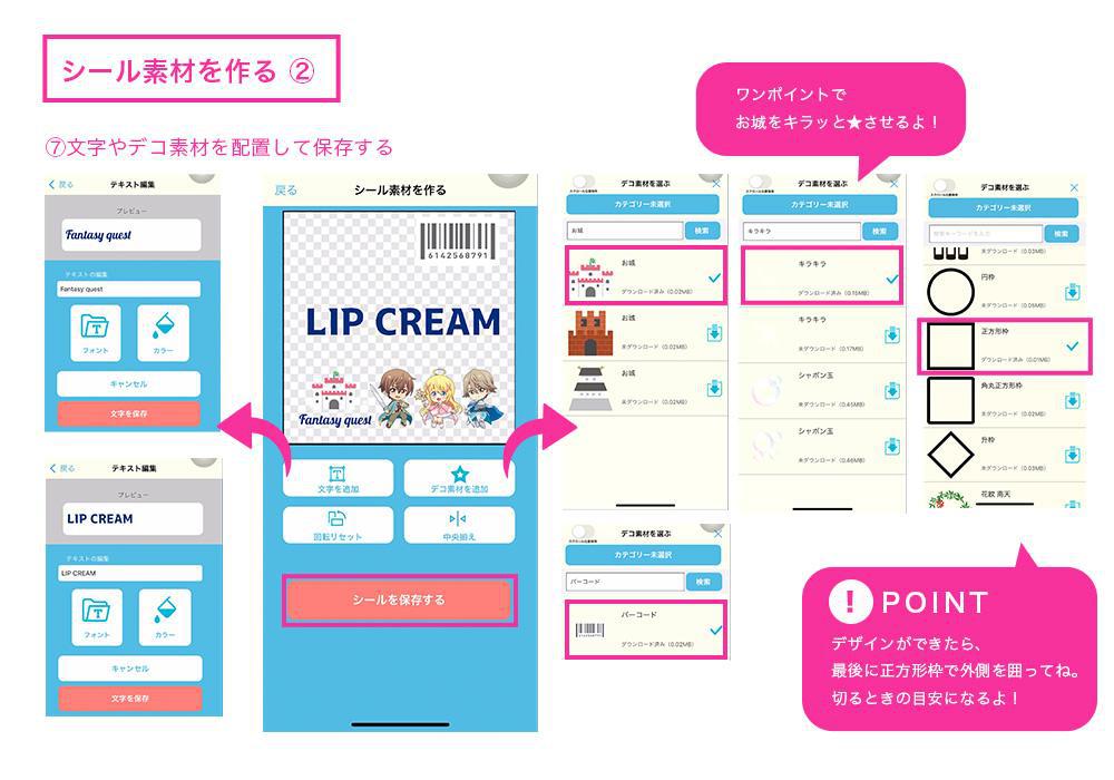 最後に「デコ素材」の「正方形枠」でシールの枠を囲うこと!これが出来上がった際の切り取る目安になるよ!忘れずに配置してね(o^^o)