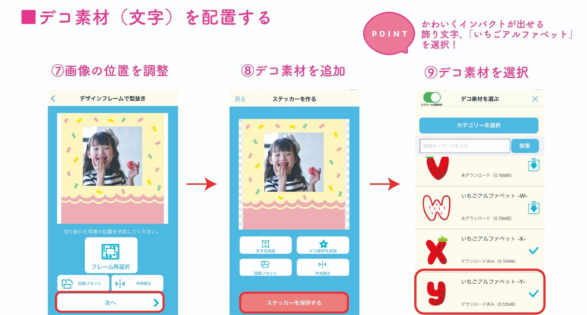 飾り文字(いちごアルファベット)にあえてくっつけるようにいちごのイラストを配置すると、デコレーションに一体感が出ておすすめです。