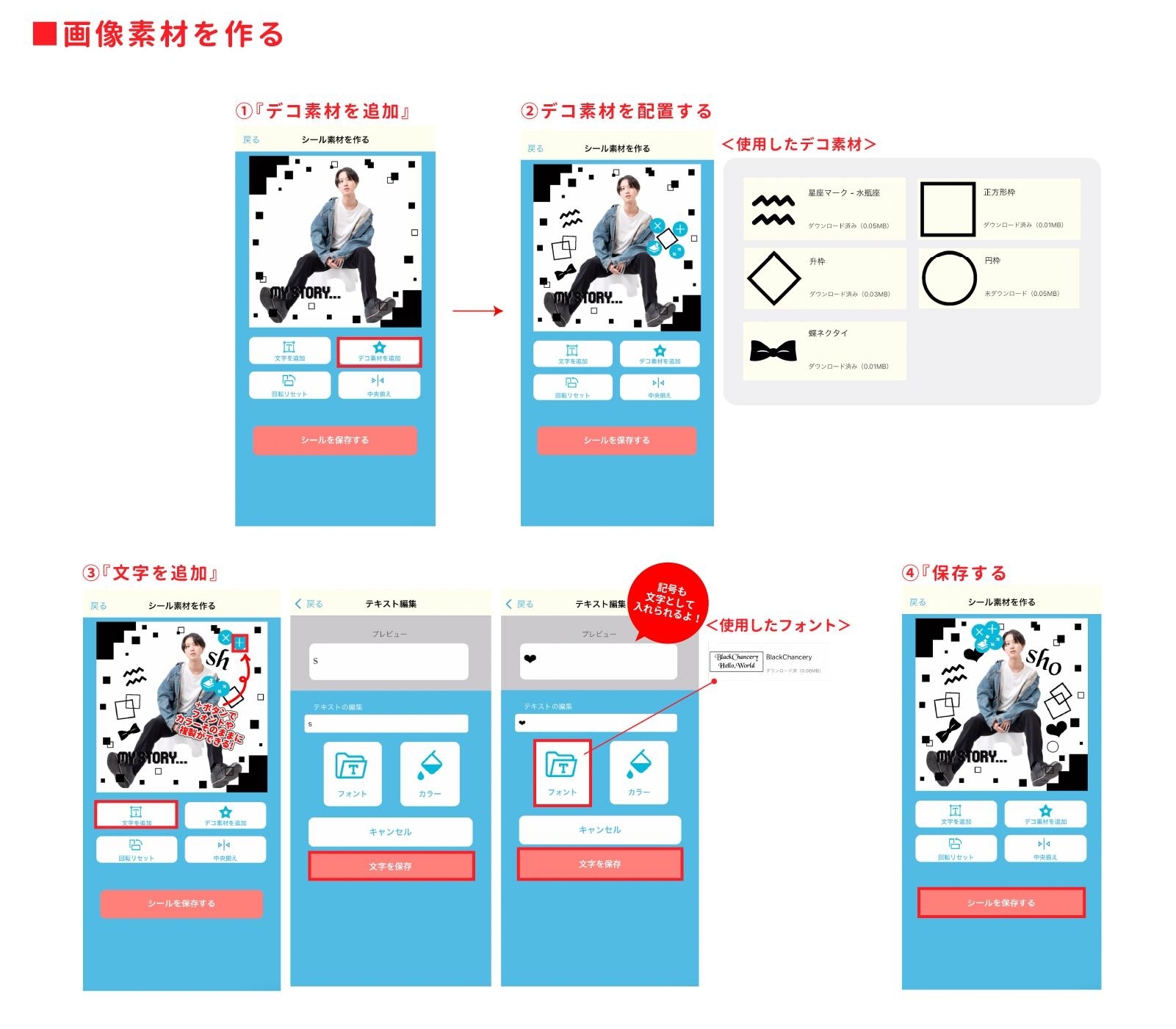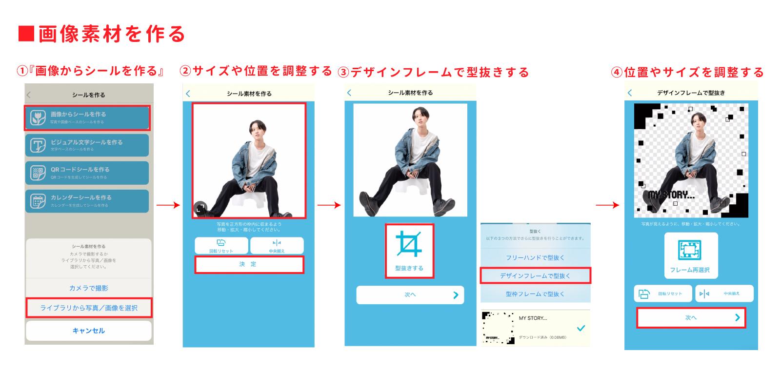 アプリを開いたら「シール」→「シール素材を作る」→「画像からシールを作る」を選択し、先ほど準備した写真を選択します。