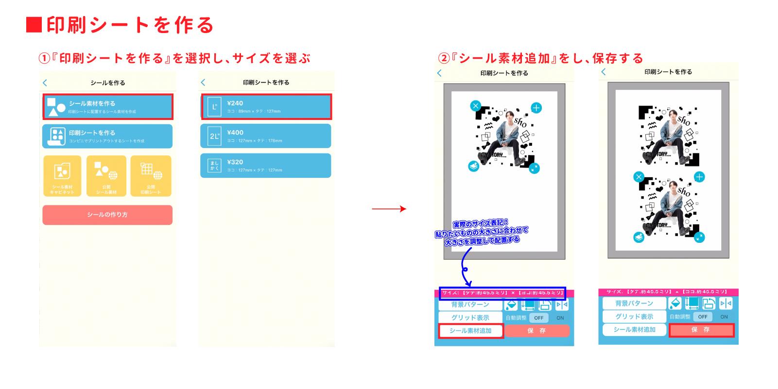 アプリのトップから「シール」→「印刷シートを作る」でサイズを選びます。