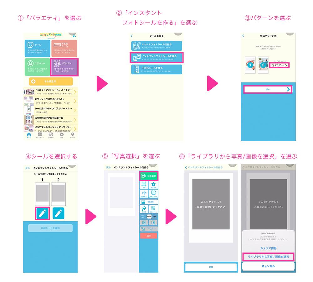 アプリを開いたら「バラエティ」から「インスタントフォトシールを作る」を選んでね。