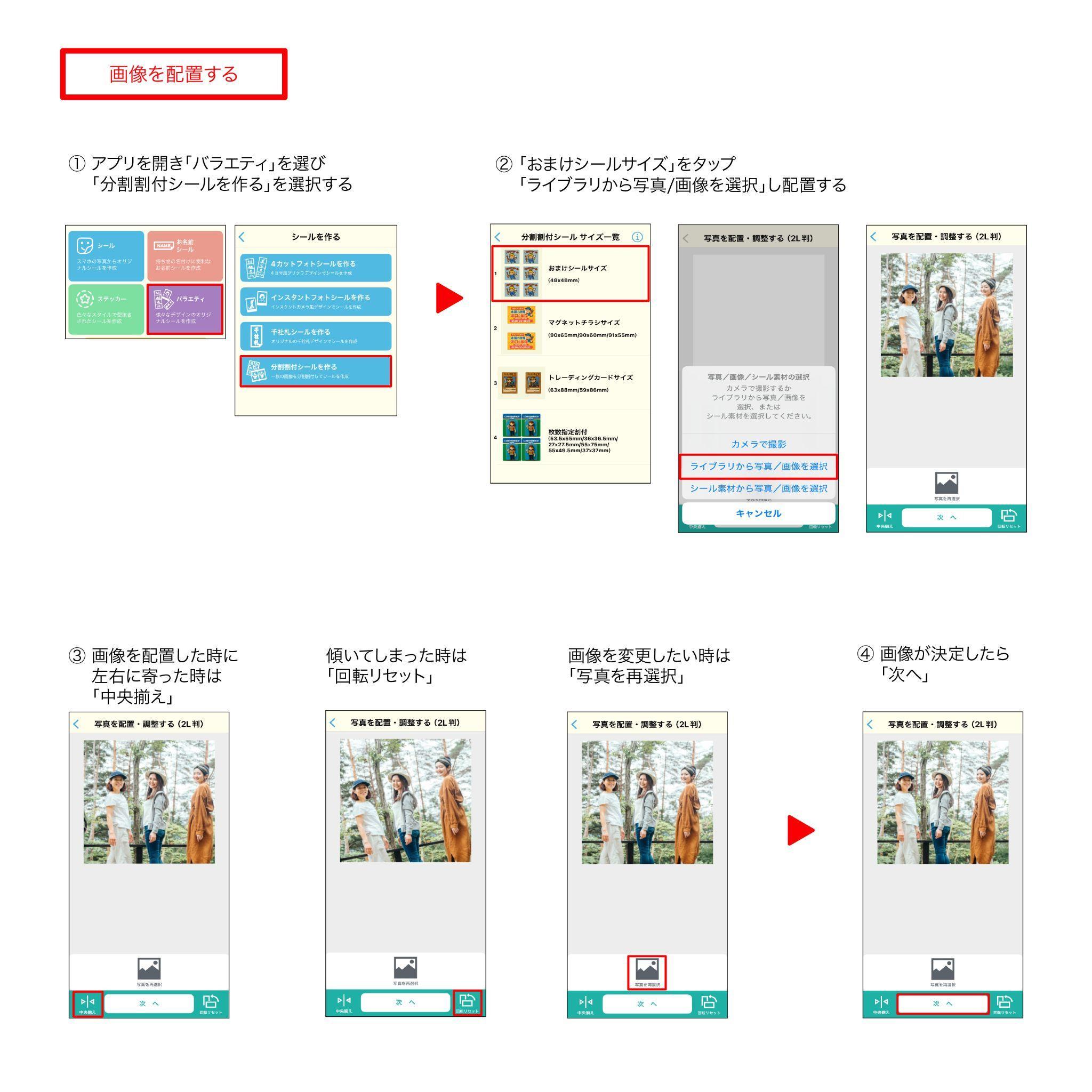 コンビニシール倶楽部のアプリを開いたら、「シール」>「バラエティ」>「分割割付シールを作る」>「おまけシールサイズ」を選択し、画像を配置します。