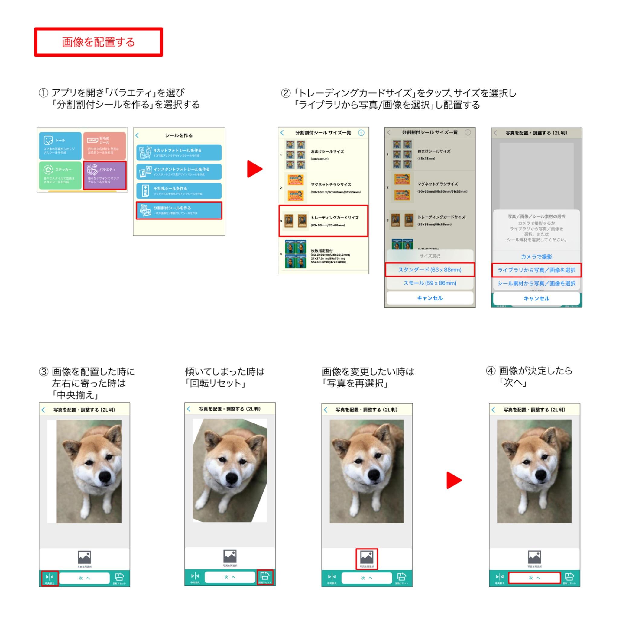 まずアプリを開いたら、「バラエティ」>「分割割付シールを作る」>「トレーディングカードサイズ」を選択し、画像を配置していきます。