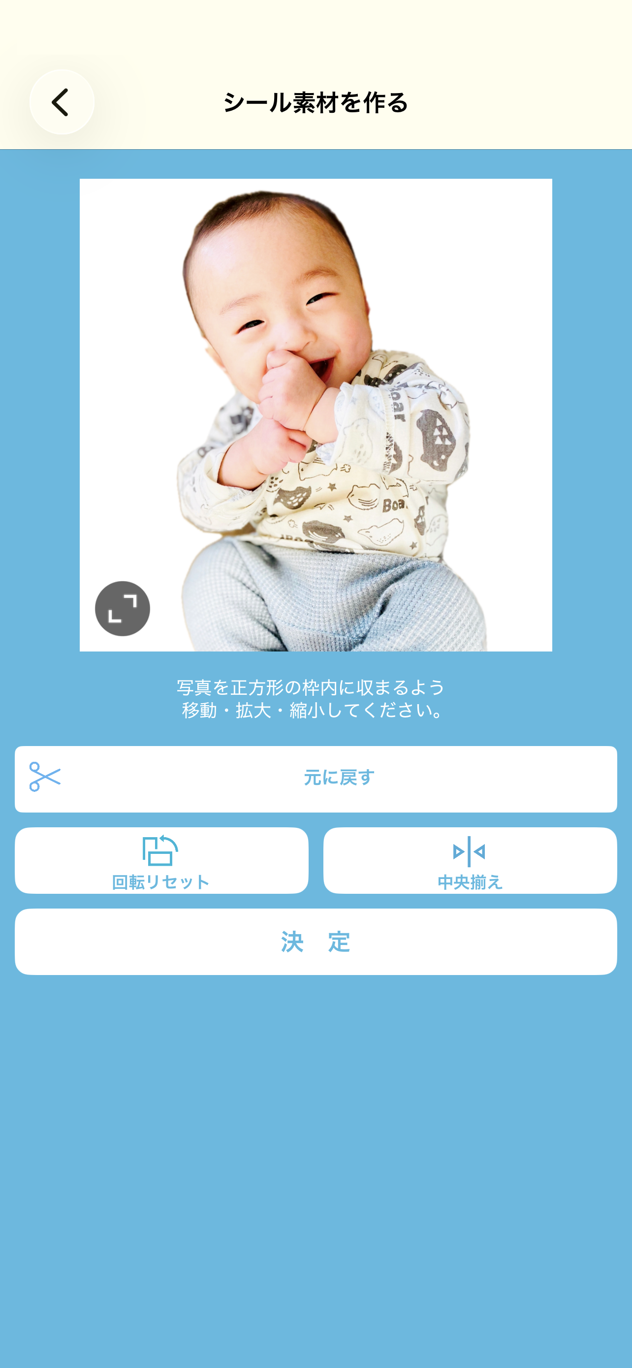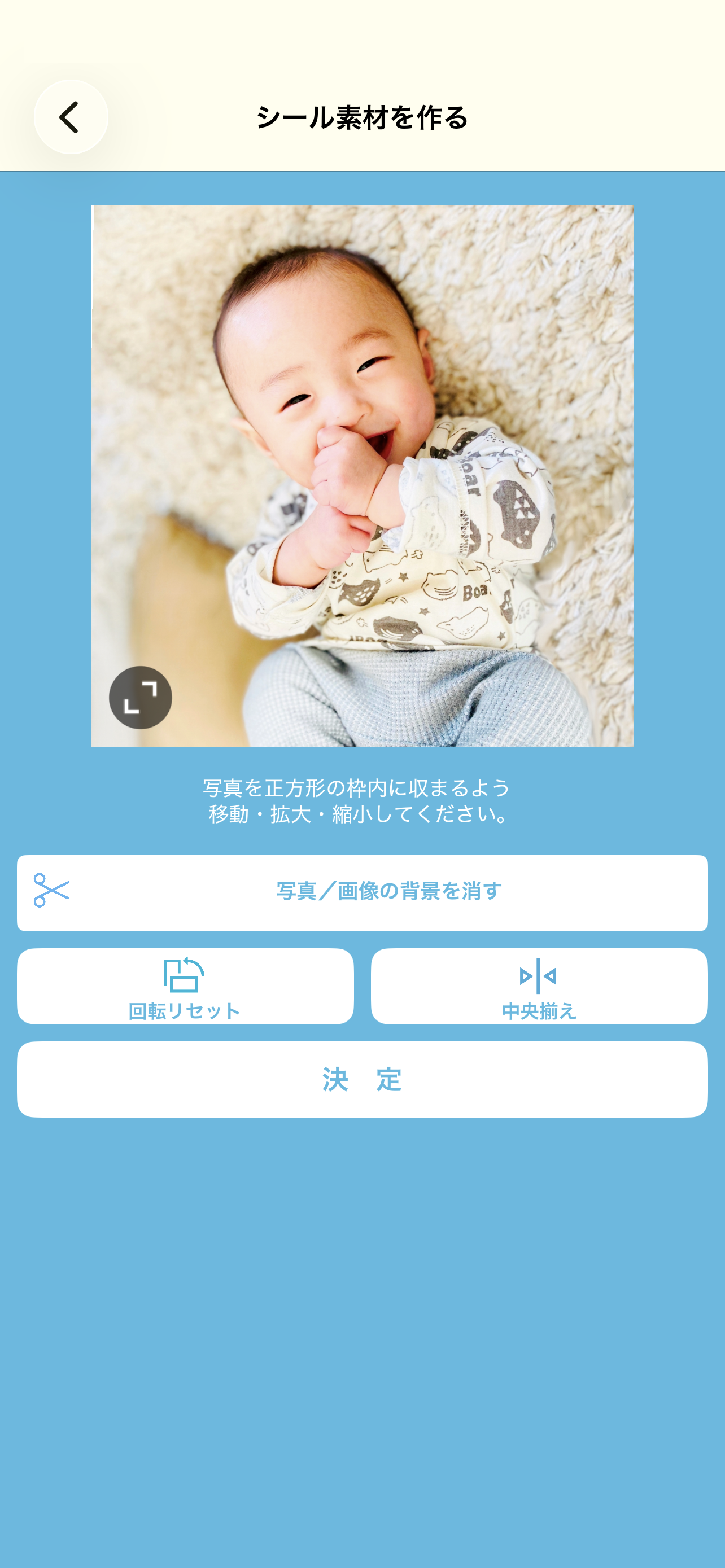 この正方形は「シール素材」の基本の形となり、被写体を正方形に収まるよう、指で拡大/縮小したり、移動したりして配置を調整してください。調整が終わったら「決定」ボタンを押して次に進みます。
