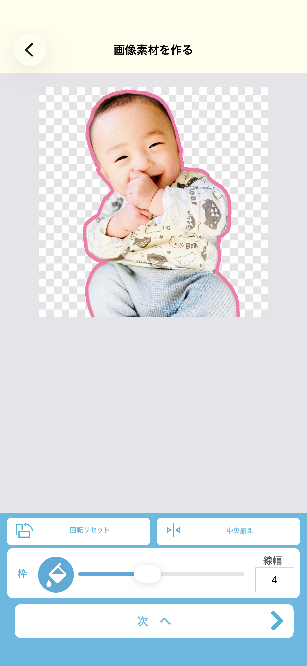 指を離したところで自動的に型抜き処理が行われ、型抜きされた範囲だけが表示され、型抜き周囲に色の縁取りをつけることが出来るようになります。「カラー」で縁取りの色を選び、「線幅」でその縁取りの線の太さを変更することができます。縁取り線の設定が終わったら「次へ」で進みます。